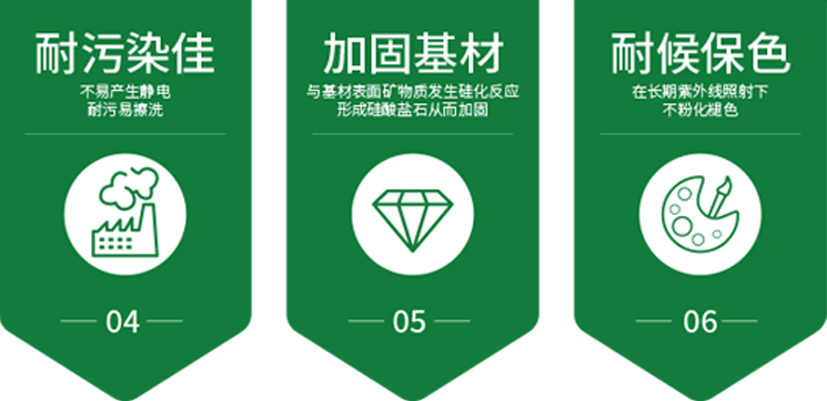弗克風(fēng)?涂料采用納米二氧化硅作為膠凝物質(zhì),并根據(jù)應(yīng)用需要,采用自主工藝對(duì)硅酸鹽材料進(jìn)行改性,弗克風(fēng)技術(shù)成功攻克傳統(tǒng)無(wú)機(jī)涂料穩(wěn)定性差、易泛堿、難調(diào)色的難題,發(fā)明出擁有國(guó)家發(fā)明專(zhuān)利技術(shù)的弗克風(fēng)硅質(zhì)漆。
