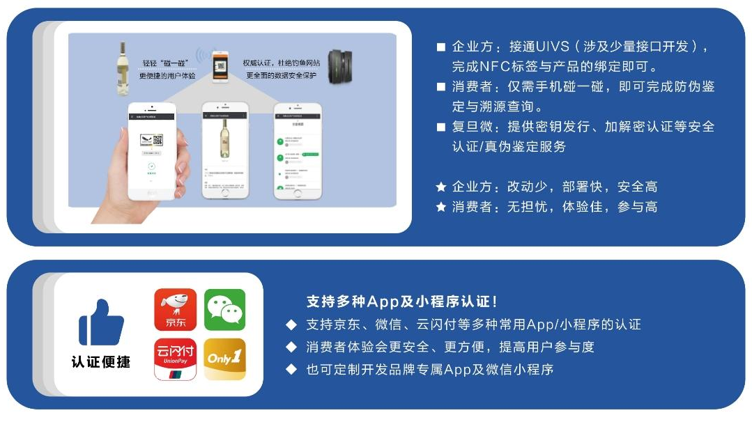 為了讓企業(yè)更便捷地用上PUF芯片指紋技術(shù),復(fù)旦微提供UIVS(Uniqueness Issuance and Validation Services),即“唯一性發(fā)行與認(rèn)證服務(wù)”,這是一項(xiàng)圍繞PUF芯片應(yīng)用的安全系統(tǒng)解決方案,旨在為客戶提供PUF芯片相關(guān)的密鑰生產(chǎn)發(fā)行、云認(rèn)證、跨域互通以及可信存證服務(wù)。且UIVS服務(wù)支持多種App/小程序的認(rèn)證,即消費(fèi)者直接使用京東app、銀聯(lián)云閃付app、微信小程序、真品無雙、品牌定制app/微信小程序即可實(shí)現(xiàn)快速認(rèn)證和溯源查詢。 UIVS服務(wù)采用SAAS標(biāo)準(zhǔn)模塊,可與企業(yè)現(xiàn)有的應(yīng)用系統(tǒng)直接快速對接,最快一周實(shí)施上線。或者企業(yè)可選擇基于UIVS的全套防偽溯源系統(tǒng),即“真品無雙”防偽溯源系統(tǒng),該系統(tǒng)包括UIVS發(fā)行與認(rèn)證系統(tǒng)、數(shù)據(jù)系統(tǒng)、及“真品無雙”及企業(yè)定制app及小程序,客戶可直接使用。 目前PUF芯片防偽溯源服務(wù)已應(yīng)用于知名煙酒茶品﹑藥品食品﹑工藝收藏﹑鑒定證書﹑潮牌運(yùn)動﹑奢品家居﹑電商平臺﹑安全物聯(lián)﹑互娛周邊等眾多領(lǐng)域。