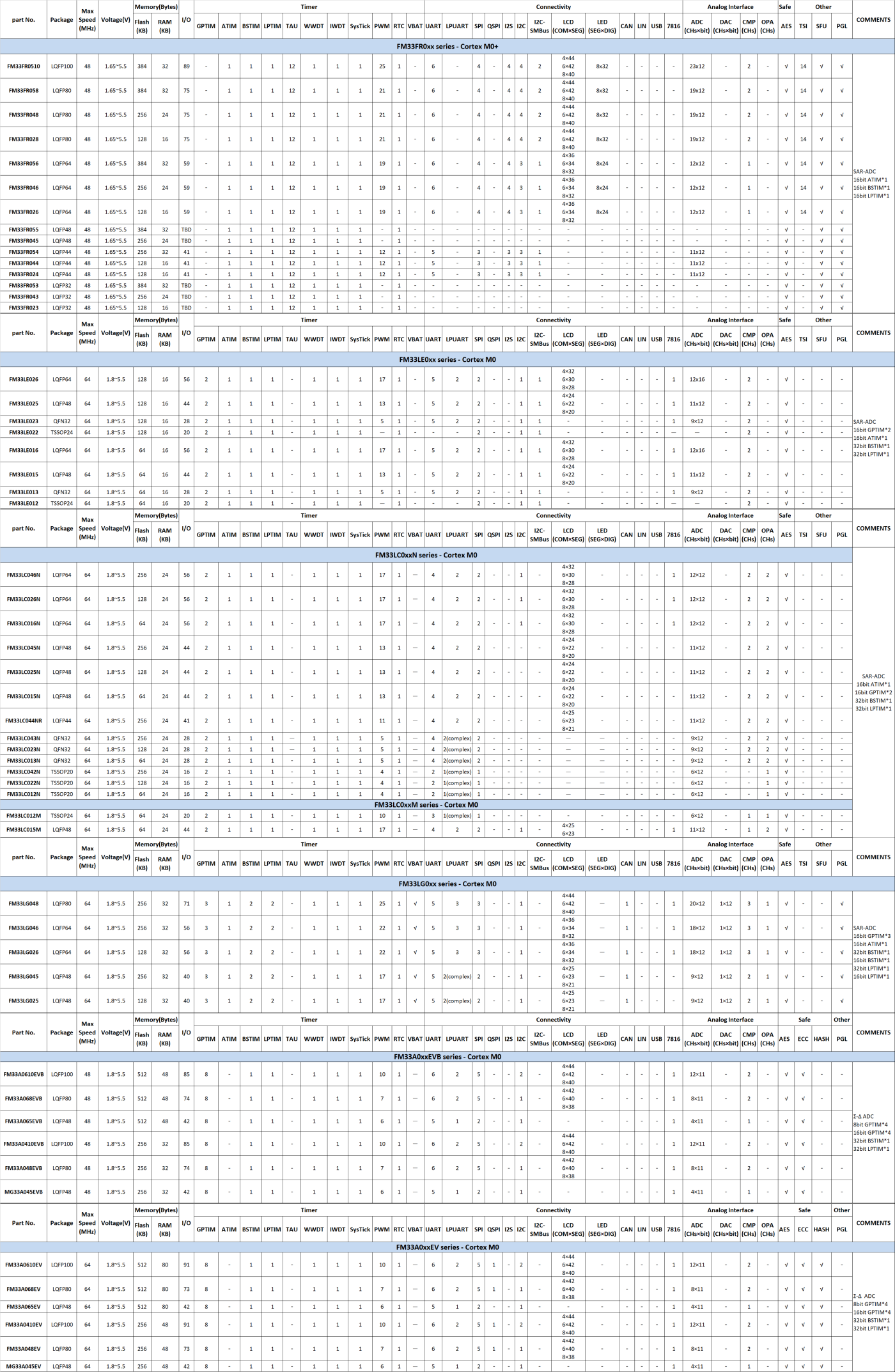 | FM33G0xx | 產品說明書下載 | 1.8V~5.5V | -40℃~85℃ | Up to 256K | Up to 24K | 6 | 3 | 1 |