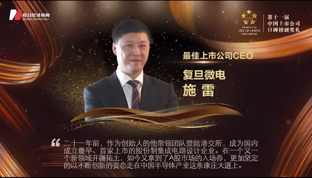 憑借多年在半導(dǎo)體行業(yè)的深厚耕耘以及帶領(lǐng)企業(yè)發(fā)展壯大的卓越領(lǐng)導(dǎo)力,上海復(fù)旦微電子集團(tuán)股份有限公司CEO施雷榮獲“第十一屆中國上市公司口碑榜——最佳上市公司CEO”。