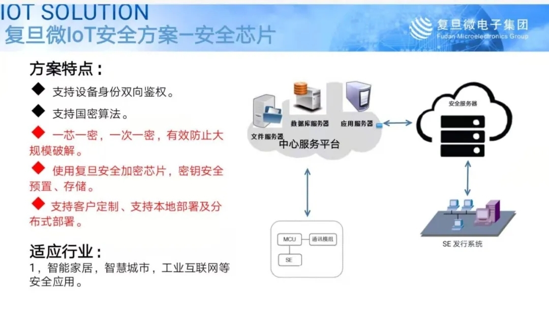 復旦微電子提供基于國密安全芯片的安全解決方案。通過雙向認證防止非法訪問,通過加密存儲,加密傳輸防止個人信息泄露。安全芯片FMSE通過銀聯卡芯片安全認證,國密二級認證等權威機構認證,保證存儲的密鑰和數據安全,能抵御目前常見的各類非法攻擊手段。