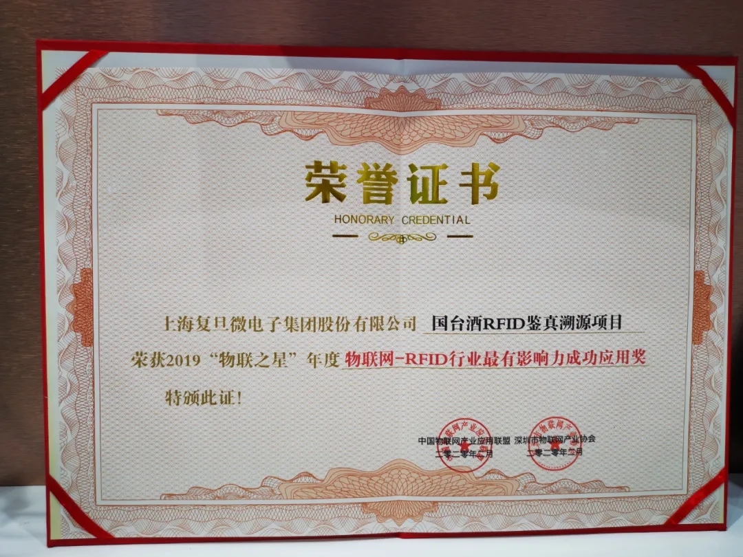 因疫情原因而遲來的“物聯之星”榮譽獎牌也“榮歸其主”,復旦微電子集團憑借去年業內大放異彩的國臺酒RFID鑒真溯源項目榮獲2019年度“物聯之星”之“RFID行業最有影響力成功應用獎”。